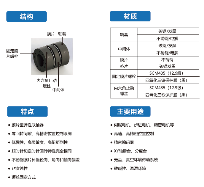 SFPS-G系列聯(lián)軸器采用碳鋼發(fā)黑,利用脹緊套聯(lián)接的膜片型彈性聯(lián)軸器,廣泛用于伺服電機(jī)、步進(jìn)電機(jī)、精密電機(jī)等。