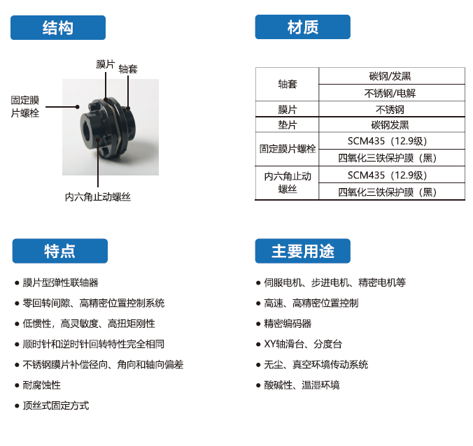 HDJP-G系列聯(lián)軸器采用碳鋼發(fā)黑,利用脹緊套聯(lián)接的膜片型彈性聯(lián)軸器,廣泛用于伺服電機(jī)、步進(jìn)電機(jī)、精密電機(jī)等。