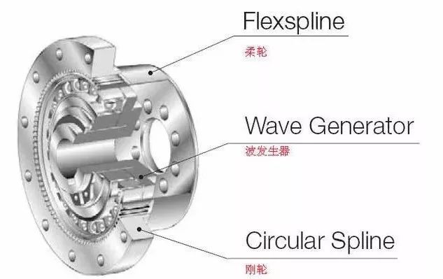 諧波減速機(jī)由“柔輪、波發(fā)生器、剛輪、軸承”這四個(gè)基本部件構(gòu)成。柔輪的外徑略小于剛輪的內(nèi)徑,通常柔輪比剛輪少2個(gè)齒。波發(fā)生器的橢圓型形狀決定了柔輪和剛輪的齒接觸點(diǎn)分布在介于橢圓中心的兩個(gè)對立面。波發(fā)生器轉(zhuǎn)動(dòng)的過程中,柔輪和剛輪齒接觸部分開始嚙合。波發(fā)生器每正時(shí)針旋轉(zhuǎn)180°,柔輪就相當(dāng)于剛輪逆時(shí)針旋轉(zhuǎn)1個(gè)齒數(shù)差。在180°對稱的兩處,全部齒數(shù)的30%以上同時(shí)嚙合,這也造就了其高轉(zhuǎn)矩傳送。