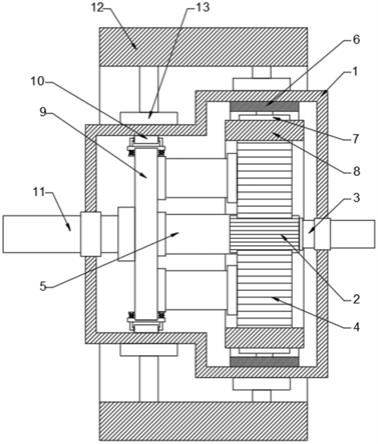 一種多重減震行星減速機(jī),包括保護(hù)外殼,保護(hù)外殼的內(nèi)設(shè)置有太陽(yáng)輪,太陽(yáng)輪的一側(cè)固定連接有輸入軸,輸入軸貫穿保護(hù)外殼在貫穿處通過軸承套與保護(hù)外殼轉(zhuǎn)動(dòng)連接,太陽(yáng)輪的外側(cè)設(shè)置有三個(gè)呈陣列分布的行星輪,行星輪與太陽(yáng)輪通過卡尺嚙合連接,太陽(yáng)輪的外側(cè)設(shè)置有齒環(huán),所有的太陽(yáng)輪均與齒環(huán)通過卡齒嚙合連接,齒環(huán)的外側(cè)設(shè)置有連接套,連接套與保護(hù)外殼固定連接,連接套和保護(hù)外殼通過若干個(gè)內(nèi)連接件連接,太陽(yáng)輪遠(yuǎn)離輸入軸的一側(cè)設(shè)置有支撐架,三個(gè)行星輪均通過連接柱與支撐架固定連接,連接柱與行星輪和支撐架均固定連接,支撐架遠(yuǎn)離太陽(yáng)輪的一側(cè)固定連接有輸出軸,輸出軸貫穿保護(hù)外殼且在貫穿處通過軸承套與保護(hù)外殼轉(zhuǎn)動(dòng)連接;