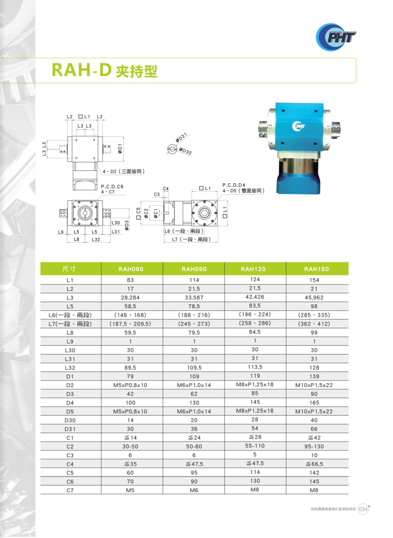 RAH-D系列是夾持型設(shè)計(jì)。 鋁合金材質(zhì)可提高散熱能力,減緩溫升現(xiàn)象造成影響。 多樣化的出力軸可因應(yīng)各種場合,客制化的入力端可搭配各式馬達(dá)。 提供各式特色之減速機(jī),供使用者依需求選購。 特殊油封設(shè)計(jì),正常使用下不需保養(yǎng)亦不用更換潤滑油,可延長使用壽命。 各式特色,體積小,省空間,噪音低,輸出扭矩高,安裝容易,可搭配馬達(dá)型號(hào)廣泛。 RAH搭配DM,一體成型的齒輪組,可有效的減低噪音。 RAH搭配DH,最佳的性價(jià)比,可廣泛應(yīng)用于各種場合。